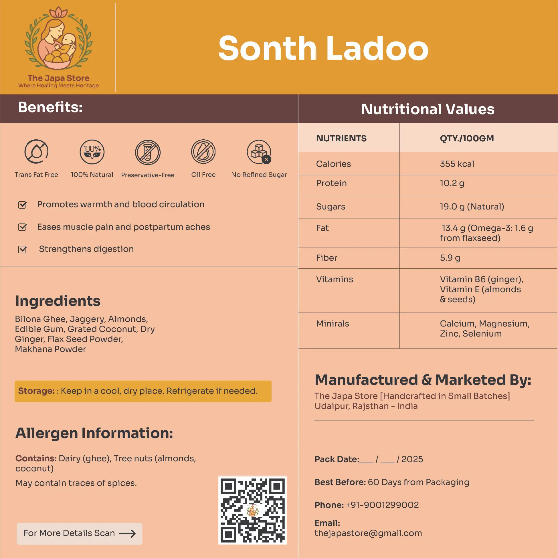 This 250g Sonth Ladoo is a nourishing Ayurvedic recipe made with dry ginger, Bilona Ghee, jaggery, almonds, flaxseed, and makhana powder. Specially crafted for postpartum recovery, it promotes warmth, eases aches, and aids digestion.